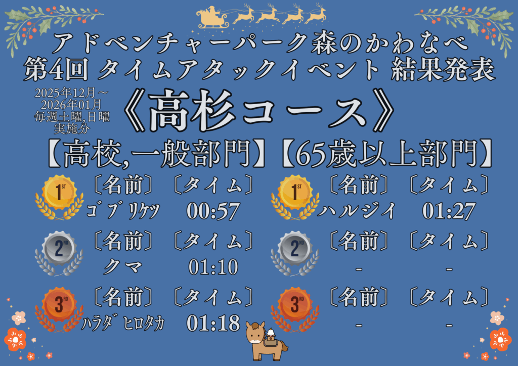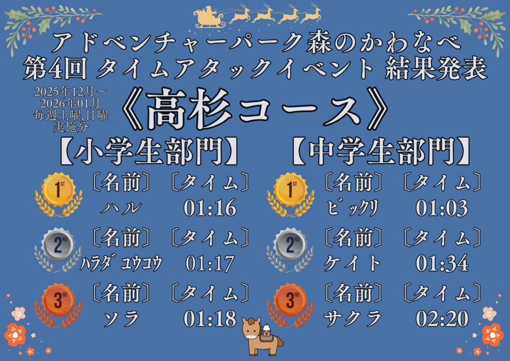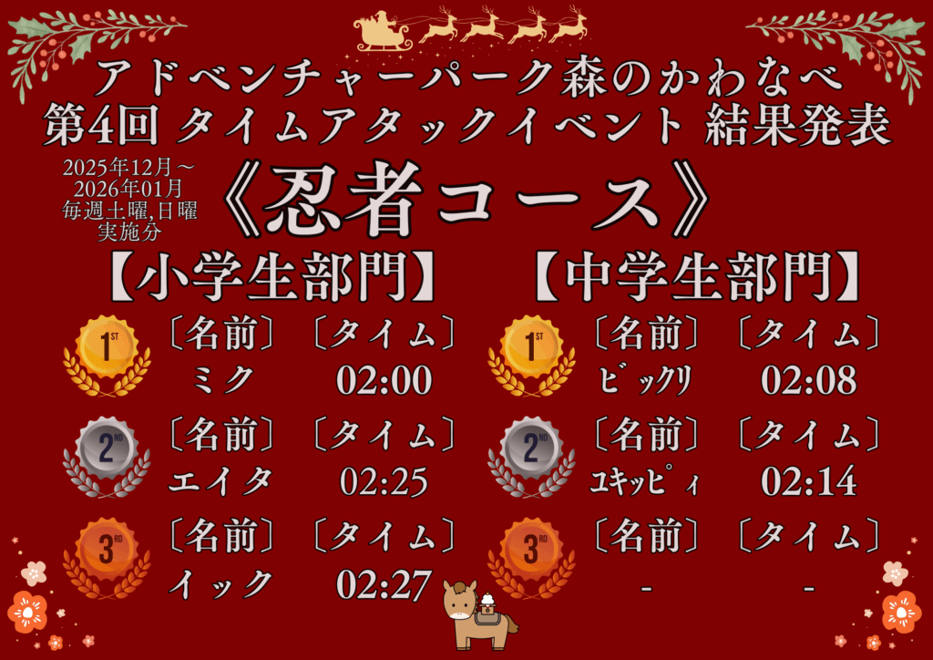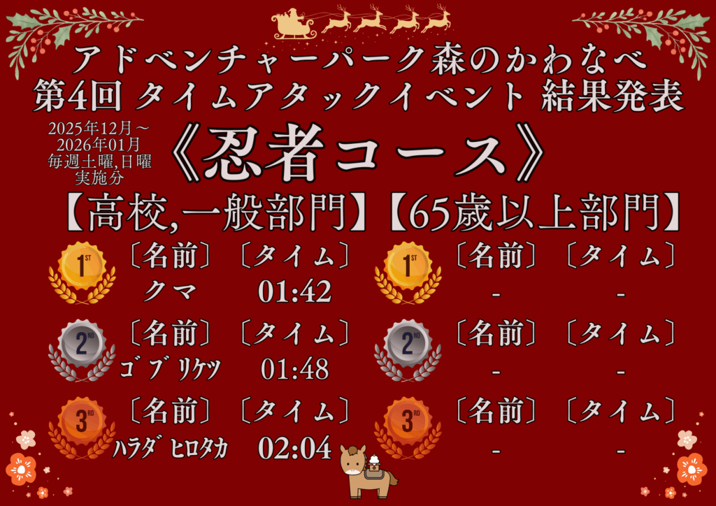 第4回タイムアタックイベント 結果発表!! 2026年2月10日 最終更新日時 : 2026年2月10日 仮山大河 2025年12月1日~2026年1月31日の毎週土曜,日曜に実施されていたタイムアタックイベントの結果が出ました♪今回は、ニンジャコースの一般部門にて前回,前々回の覇者「ゴブリケツ」さんを抑えて「クマ」さんが1位に!最終日の1月31日にギリギリで記録を塗り替えました♪ Bluesky